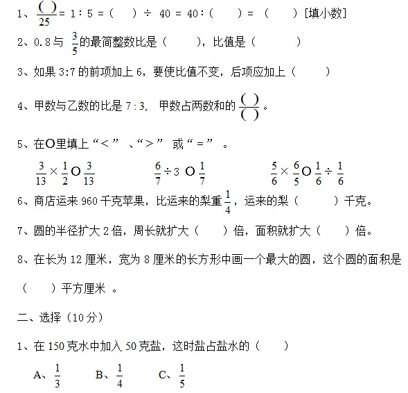 青岛版六年级数学上册期中检测试题