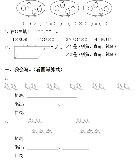 2、先把乘法口诀补充完整,再写出两道乘法算式。