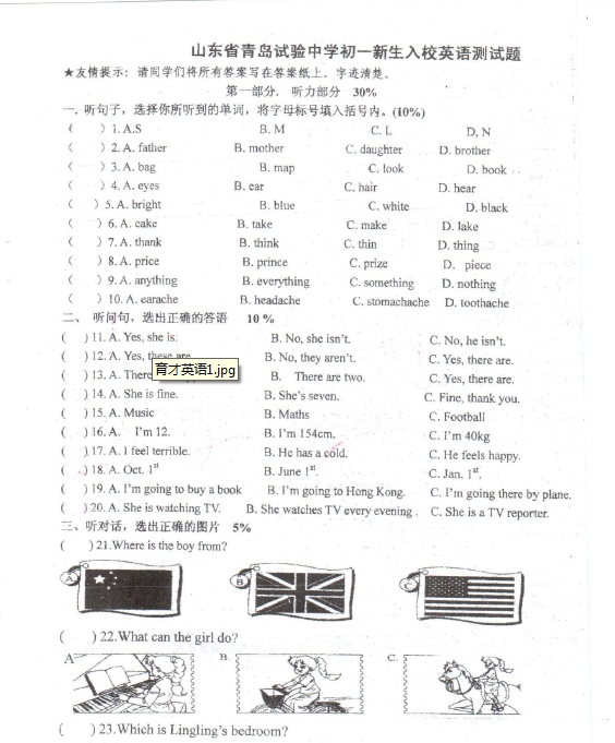 【查看原帖并参与讨论:青岛实验初中(育才)入学分班考试英语试卷】