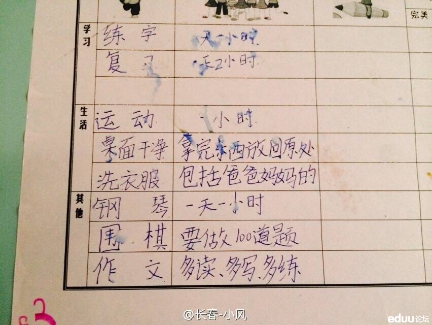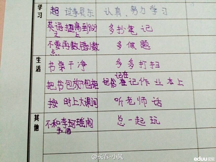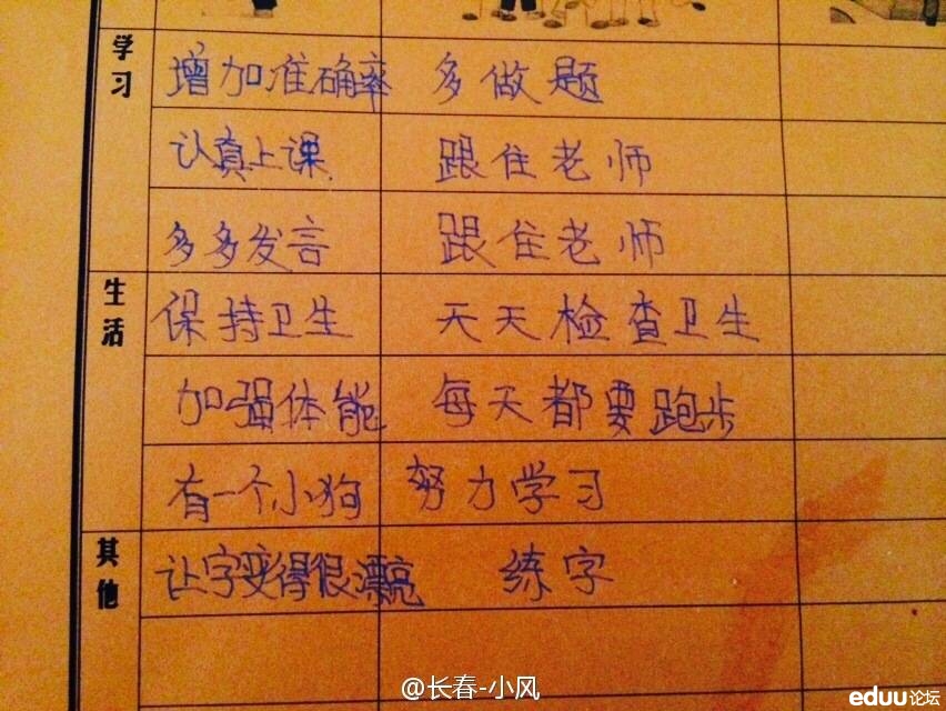 近日,网友在微博上贴出了一组照片,是长春市一小学的小学生们的成长计划,孩子们的小目标和实现目标的方法在充满童趣的同时却也略显“正统”。