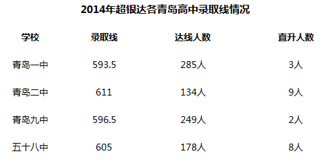2014年超银共有毕业班18个,学生约840人,达到普通高中录取线535分以上的619人,普高达线率74%,其中:
