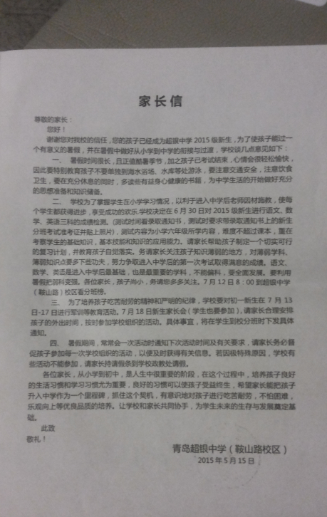 2015年青岛小升初,超银中学的2015年小升初第一阶段招生已经结束了,下面是青岛超银中学给第一阶段录取的2015青岛小升初家长的一封信,供参考。