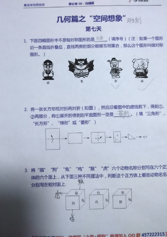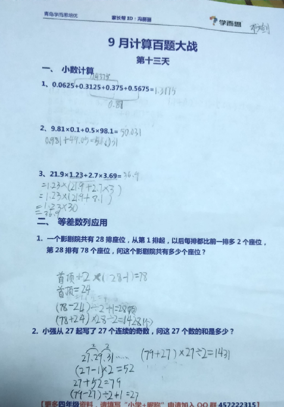 青岛四年级9月22日计算和几何试题及答案(2)