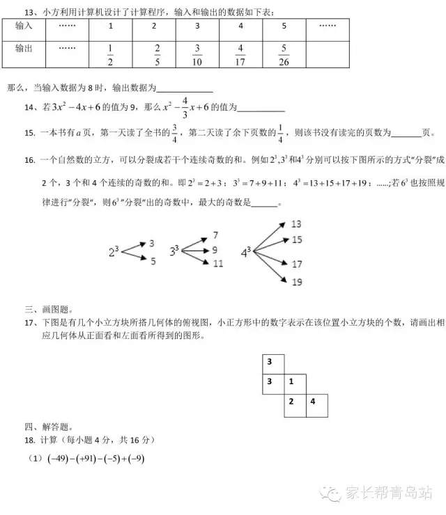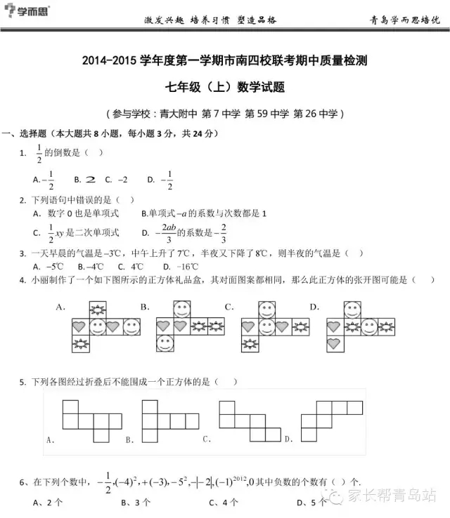青岛李沧区各初中学校的期中考试已经开考两天了,之后青岛市南市北区的各初中学校也即将开始新初一的期中考试。初一期中考试不仅是对今年小升初学生升入初中后的一次检测,也对即将开始2016青岛小升初的学生具有重要的参考价值。为了更好的熟悉青岛市南区期中考试的试题形式,本文将分享一下,2014-2015学年青岛市南区七年级期中考试数学试卷,供参考。