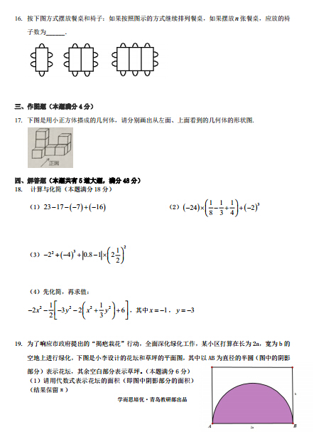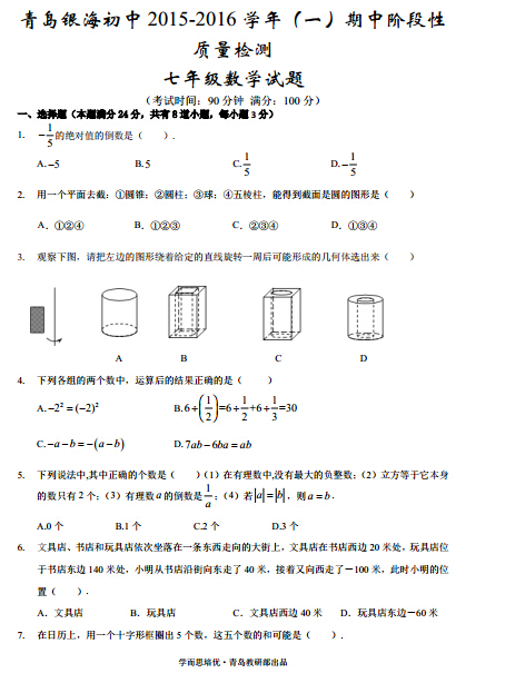2015年下半期青岛银海中学和51中七年级(初一年级)期中考试结束了,下面小编将青岛银海中学和51中本次期中考试的数学试卷及答案分享如下,供2016青岛小升初择校家长参考。