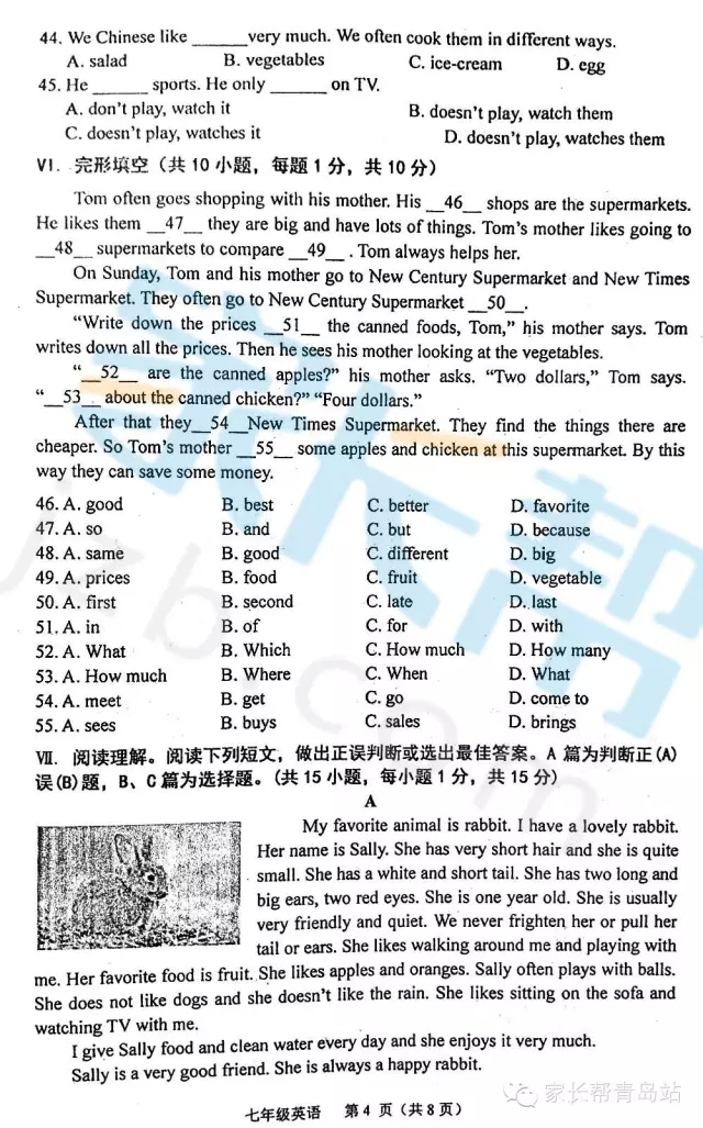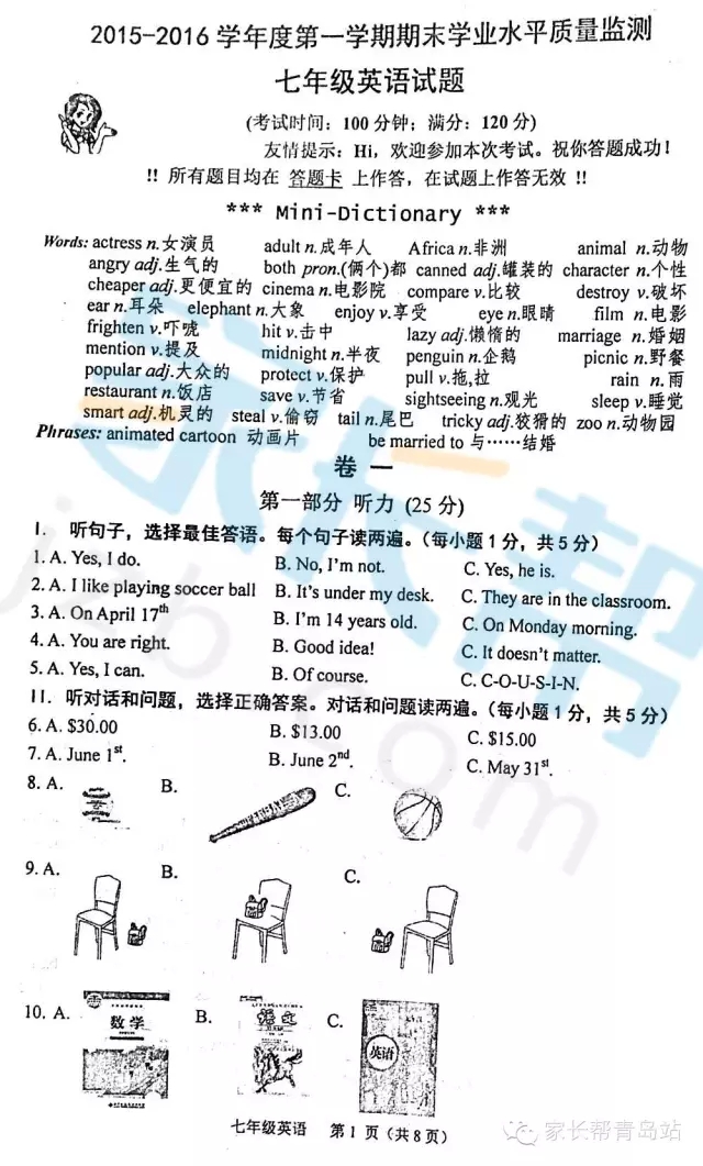 青岛中小学生迎来了2016年的寒假生活,不过,对于面临2016青岛小升初的六年级孩子来说,,寒假还是提前熟悉一下初中的知识的,下面小编收集到了青岛市南区七年级英语上册期末考试的试卷,供2016青岛小升初学生寒假复习参考。