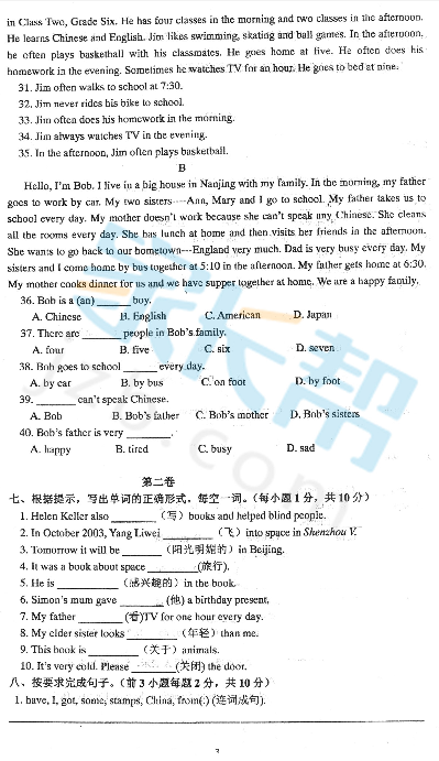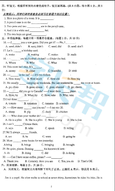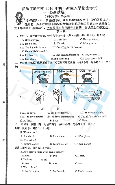 2016年青岛实验初中小升初分班考试英语卷及答案