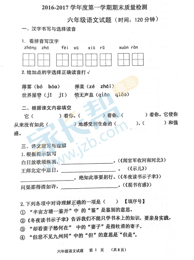 2016-2017青岛市北、崂山六年级第一学期期末考试语文试卷