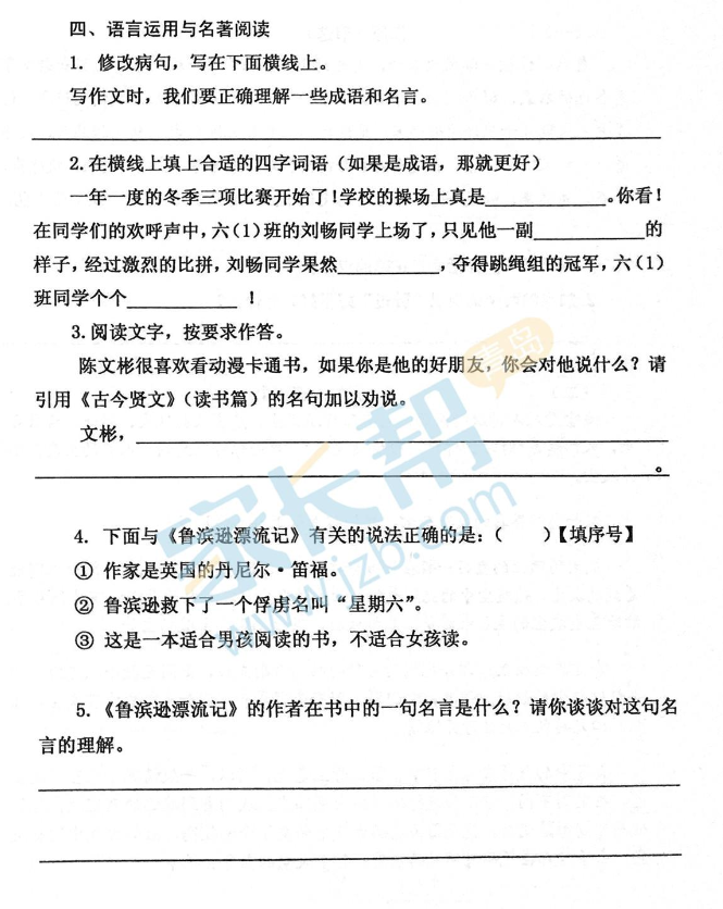 2016-2017青岛市北、崂山六年级第一学期期末考试语文试卷(2)