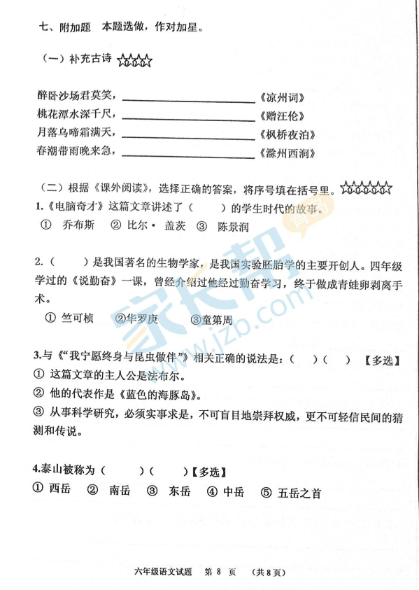 2016-2017青岛市北、崂山六年级第一学期期末考试语文试卷(7)