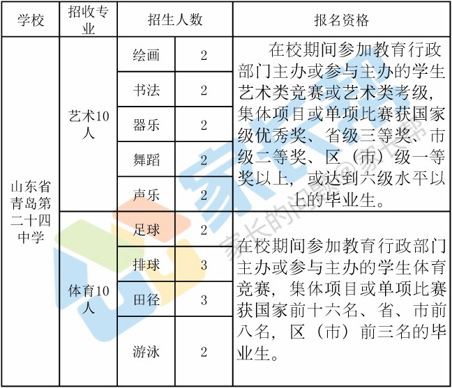 为全面贯彻党的教育方针,培养全面发展的特长生,根据市教育局《青岛市教育局普通中学体育艺术特长生特长班招生办法(试行)的通知》的有关政策规定,我校本着公开、公平、公正的原则,面向全区招收思想品德优秀且在艺术、体育方面有突出特长的优秀小学毕业生。