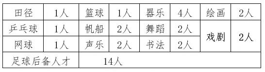 凡具备上述1、2条的学生有资格参加体育特长生专业测试,具备1、3条的学生有资格参加艺术类(音乐、美术)特长生测试,具备1、4条的学生有资格参加足球后备人才测试。