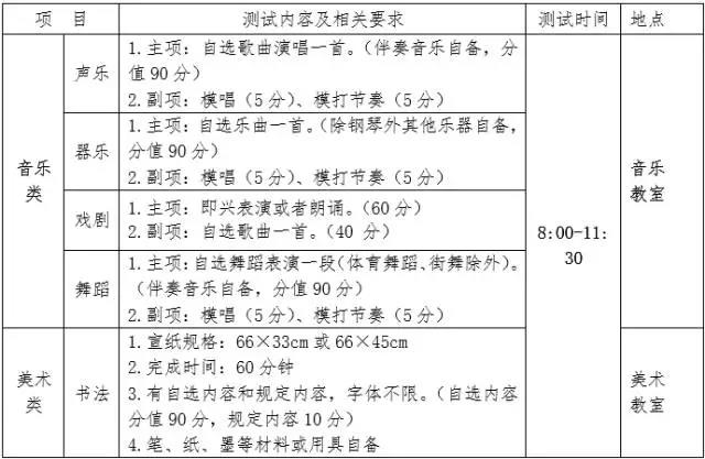 考生到崂山三中参加专业测试(家长在考场外等候)。各项目测试具体内容、时间、地点如下: