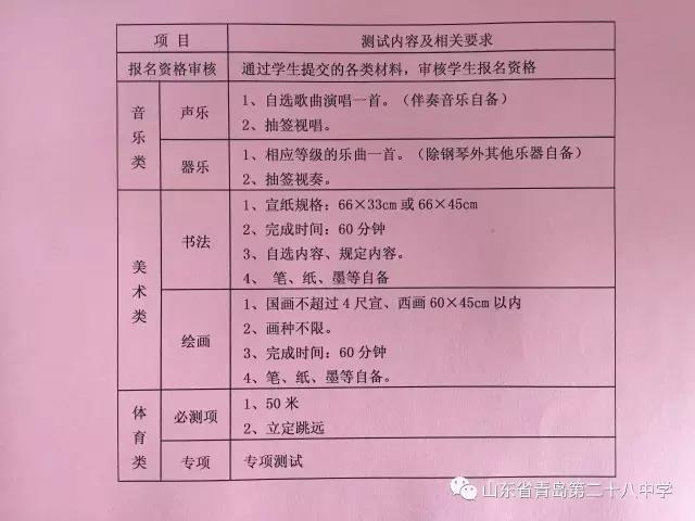 3、公示时间、地点:青岛二十八中官方网站看录取公示。凡被我校录取的特长生,将不再参加民办初中、公办学校的电脑派位或整体调拨的招生录取。