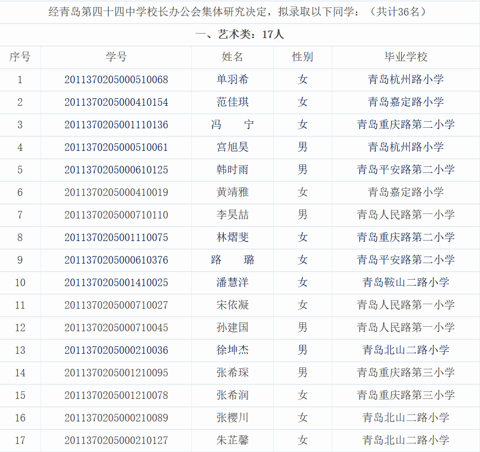 2017年青岛第四十四中特长生、足球后备人才拟录取名单公示