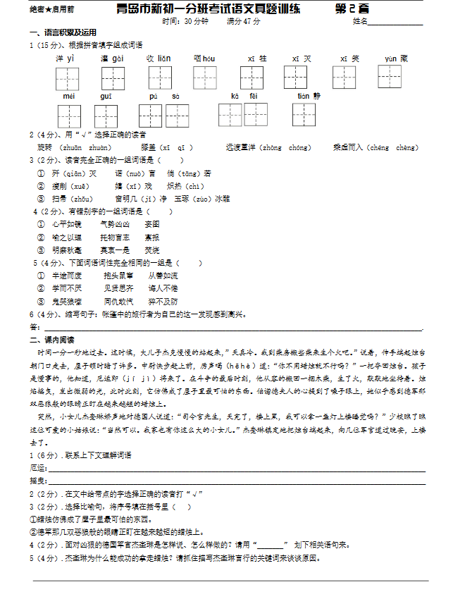 2017年青岛小升初分班考试语文真题卷二(视图版)
