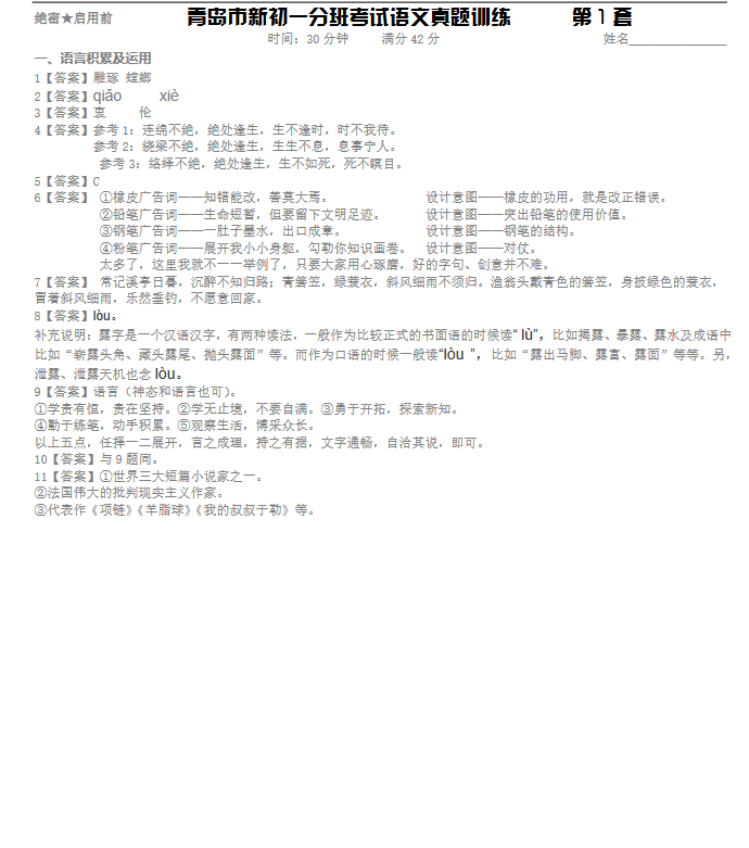2017年青岛小升初分班考试语文真题答案一(视图版)