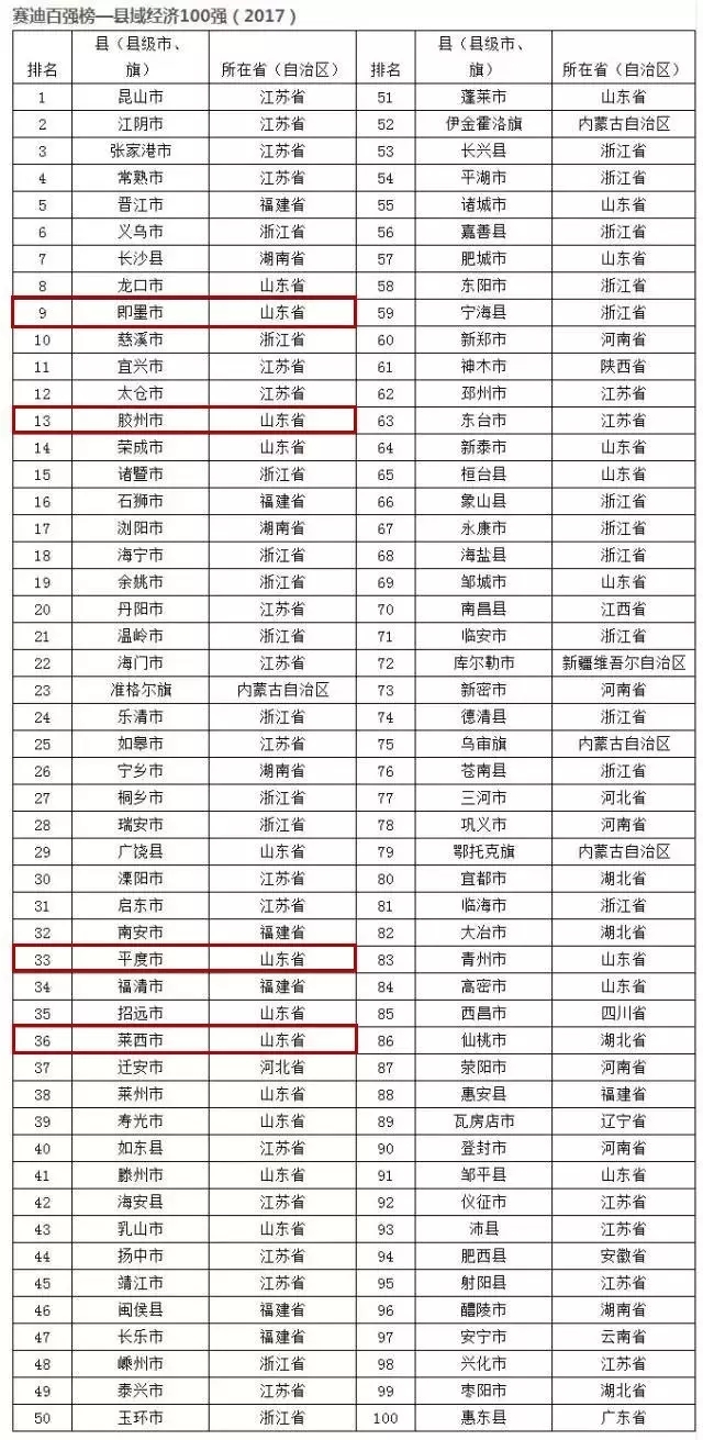 上周,工信部所属的智库发布了“赛迪百强榜——县域经济100强(2017)”,咱们青岛的即墨、胶州、平度、莱西毫无悬念全部上榜成功!即墨更是跻身全国前十,位列第9位!