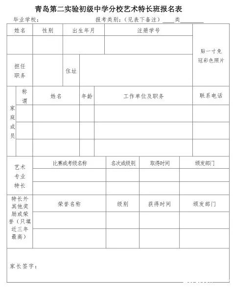 (2)青岛市市内四区初中招生报名单。(加盖学校公章)