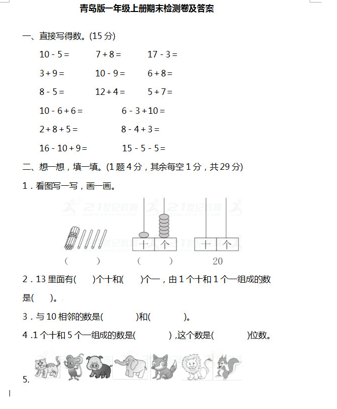 2019年青岛小学一年级数学期末模拟卷五(图片版)