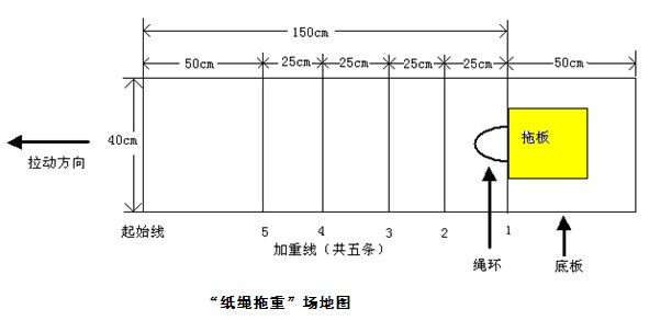 3.一人站在起始线外用双手拿着纸绳的一端(双手不能超过起始线),另一人向拖板上加杠铃片(至少一块杠铃片),然后用纸绳拉动拖板。在拖拉过程中,拉拖板参赛者手中的纸绳始终要保持1.5米长(即双手握绳处与拖板的距离)。