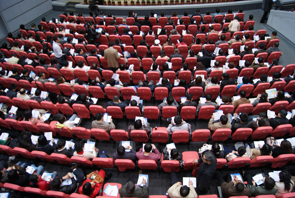 在晚上18:30左右,上海图书馆二楼已经是席无所缺,后到的家长只能跑上面坐席了,一位学生的家长,抢先一步把上楼的第一排抢到位置后“宁坐鸡头,不坐凤尾”笑言道。众多家长全副武装,坐下后,手机照相机录音笔等工具全部掏出,手上拿这《2011小升初攻略》、中环杯家长会资料(历届中环真题模拟)、智康个性教育、和自带笔记本全神贯注着等待着开讲。