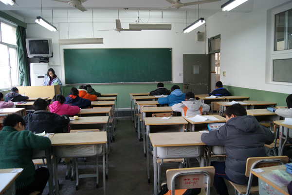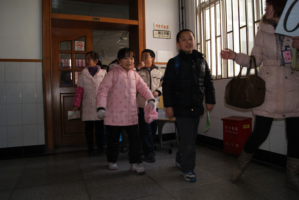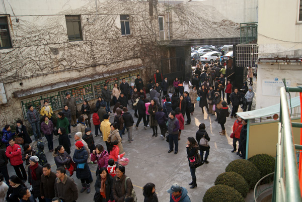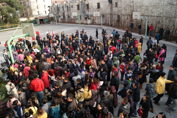 在考场门口吃了一个半小时的冷风的家长们在考试结束前15分钟,安排到考场下的大操场,以迎接考完后自己的孩子,一出门就问长问短,考试题目难不难,考出来没有等等。