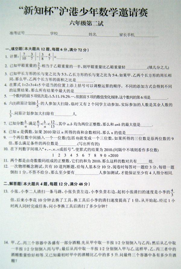 “新知杯”沪港少年数学邀请赛(六年级第二试)