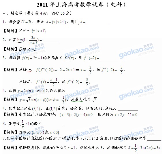 2011年上海高考数学试卷(文科)