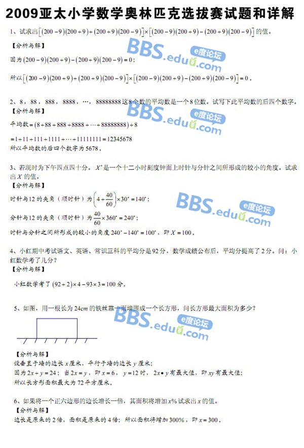 2009亚太小学数学奥林匹克选拔赛试题和详解