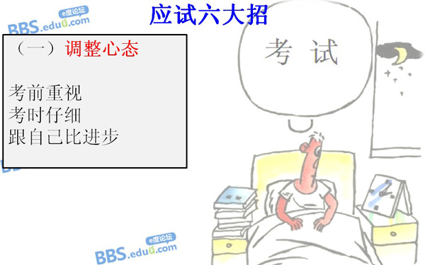 最后还有一个必胜的保证——心态,相信有很多人都知道,心态很重要,可以说在考试中起很大的作用,拥有好的心态,然后投入、自信、坦然,相信会取得好成绩!