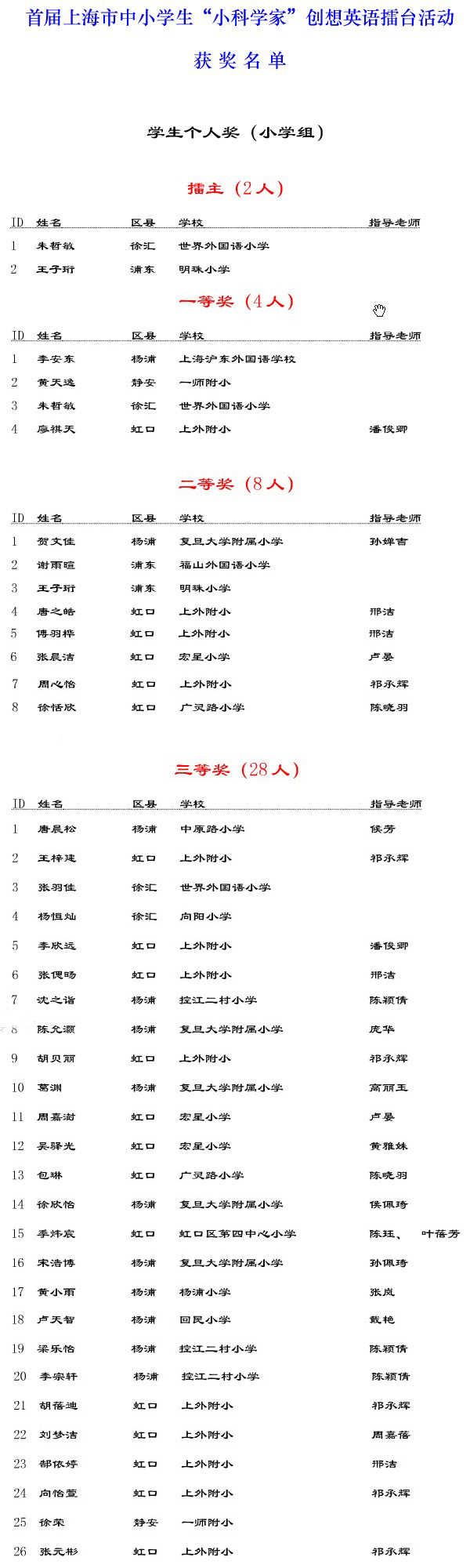 首届上海市中小学“小科学家”创想英语擂台活动获奖名单
