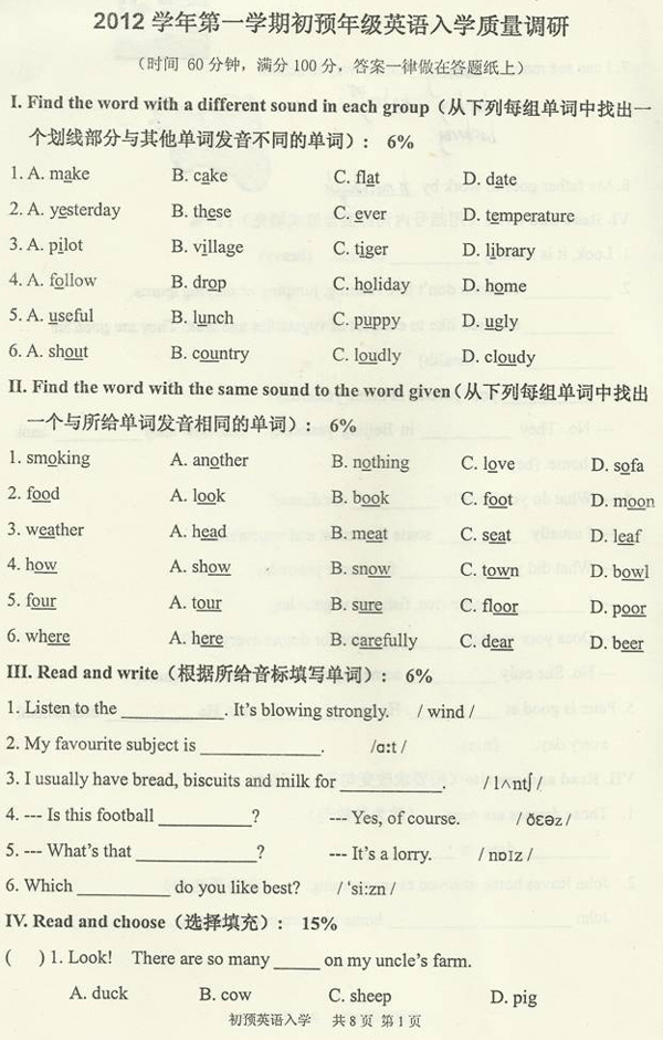2012年上海预初开学英语水平测试卷 上海奥数网 2012-09-17 11:38:43 上海奥数网9月17日:小升初结束后,进入预初大部分学校都会有摸底考试,这里奥数网整理了一套英语的水平测试卷,欢迎大家参考。>> 点击查看各中学最新消息汇总频道 >> 推荐阅读 小升初最新消息汇总频道页 各杯赛最新消息汇总频道页 首页 上一页 下一页 尾页