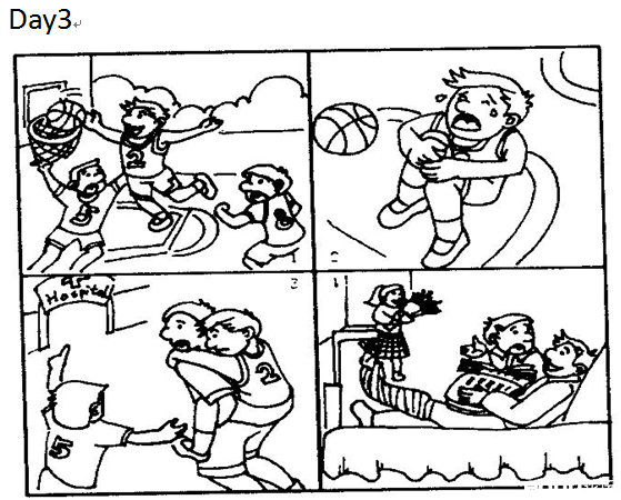 Last Sunday was a sunny day. I went to the park to play basketball withmy friends. We were playing happily when suddenly Peter fell over and hurt hisleg. We carried him to the hospital at once. The doctor looked over his legcarefully, and said his leg was broken. He needed to stay in bed for some time.We felt very sorry for him. Next time we should be more careful when we playbasketball. Now we take turns to go to help him with his lessons in thehospital. He feels very happy and gets much better now.