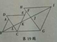 19、四个等边三角形如图排列,它们的边长都是整数,且构成一个等差数列。B、C、G三点共线,=,值是一个循环小数,则IH的最小值为_______________
