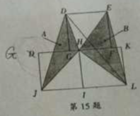 15、如图,三个边长为6的正方形放在一起,连接它们的顶点形成两个三角形A和B(图阴影表示)。我们用SA表示A的面积,SB表示B的面积,若,则此事的△DHL的面积为________