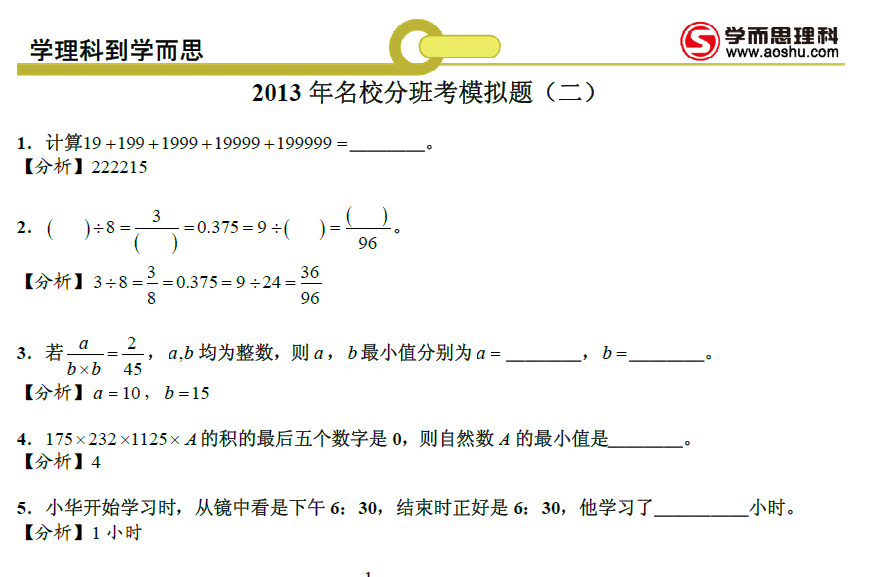 点击下载完整试题答案>>>2013年上海名校分班考模拟题(二)答案
