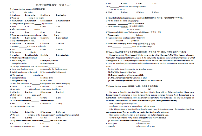 2014年上海名校分班考英语模拟题及答案解析(二)