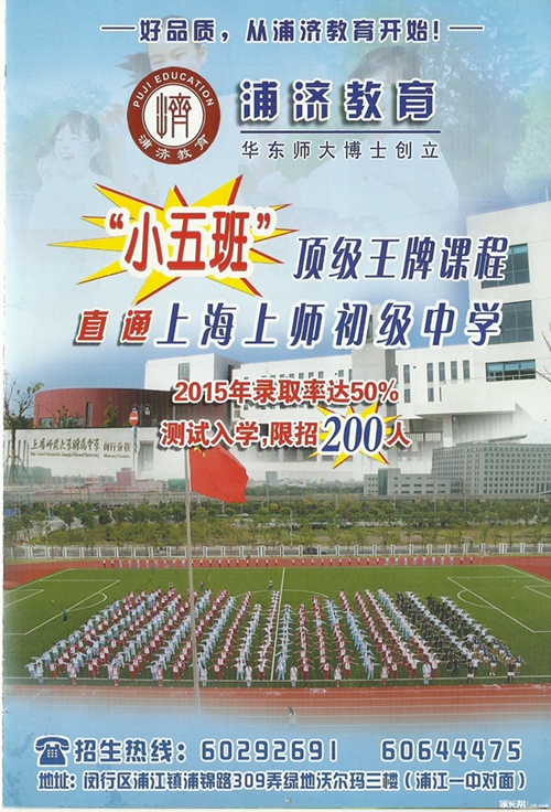 2015年上师初小五班录取率达50%,测试入学(每周六下午2:00、测数学和英语),限招200人。