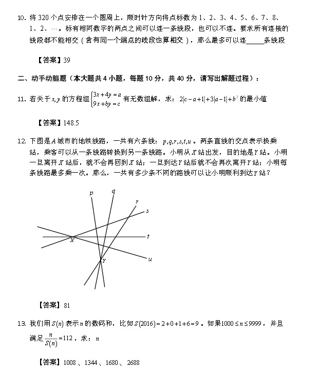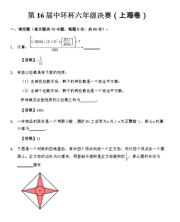 2016上海第16届中环杯决赛六年级试题答案 上海奥数网 2016-03-11 11:15:42 2016年上海第16届中环杯决赛3月5日开考,奥数网第一时间公布中环杯决赛试题及解析,敬请关注。 【六年级中环杯决赛试题及答案】 点击下载2016年中环杯决赛六年级试题及答案