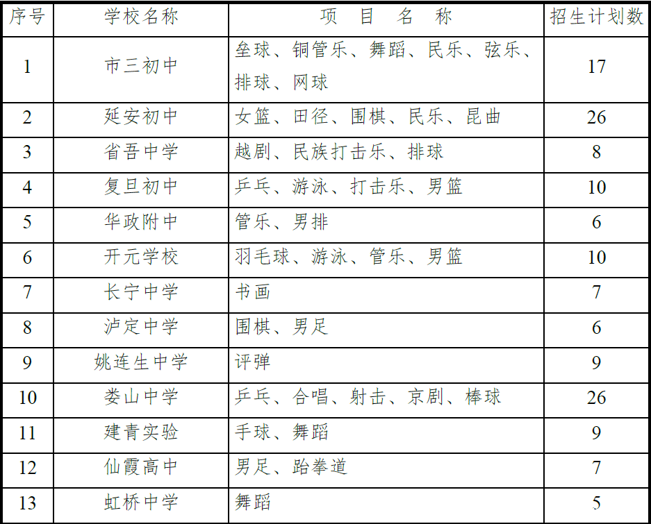 长宁区2016年体育、艺术、科技特色初中特长生招生项目和计划一览表