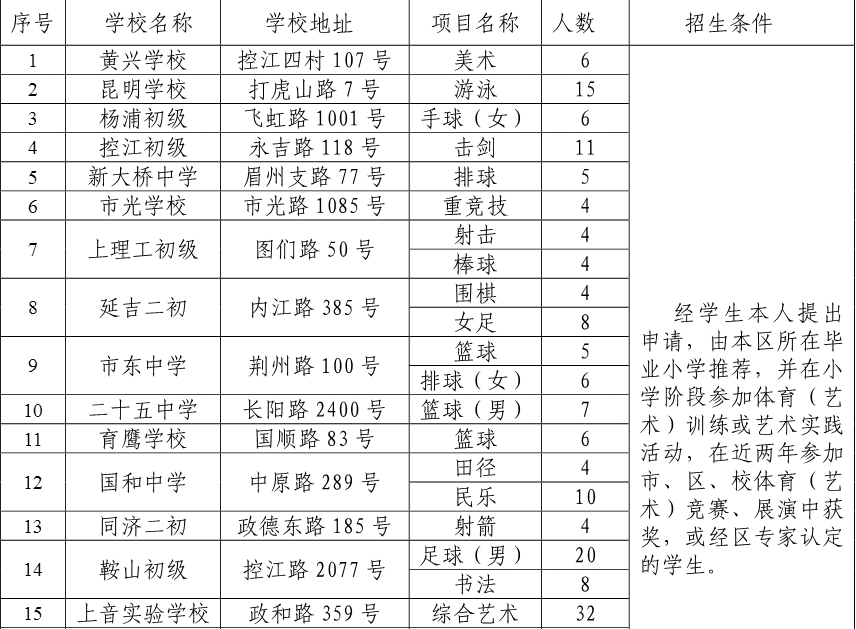 杨浦区2016年体育、艺术、科技特色初中特长生招生项目和计划一览表