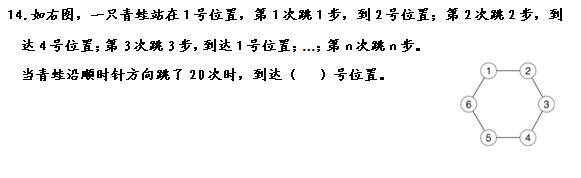 动手画了画,发现每跳6步回到1号,找到规律了。找规律这件事我还是比较拿手的。不过这题居然有个小陷阱,跳一步是到2号,跳两步是到3号……还好被我发现了!计算的时候稍微有点费劲。(做除法我还不是很熟练)
