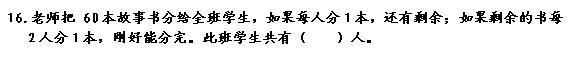 分故事书?盈亏啊。可是不对啊,做不了。仔细读题,由于人数前后两次一样,每人分一本与每2人分一本,也就是分出去的书前后两次是两倍关系。对应总数60本。画了个线段图,原来是一道和倍问题。还好我聪明。