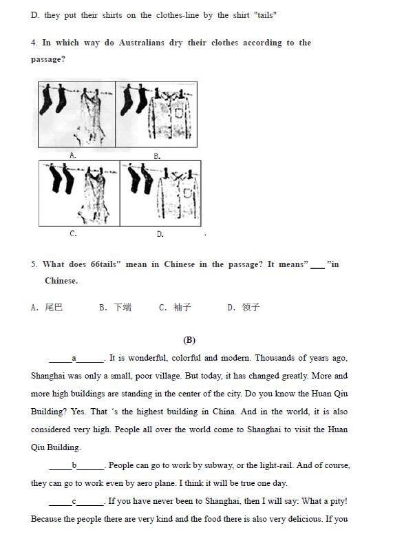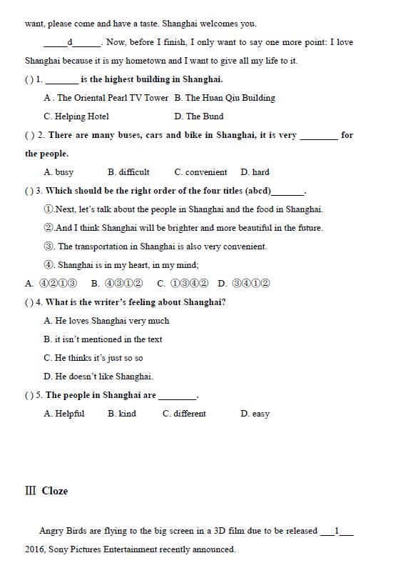 2017年上海五年级中环杯英语模拟试题答案(3)
