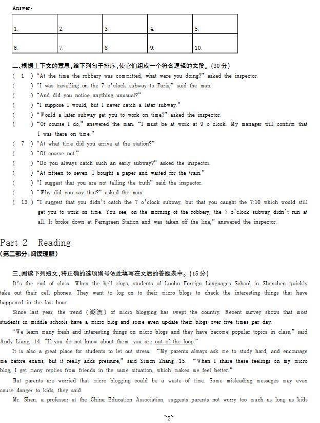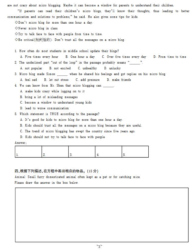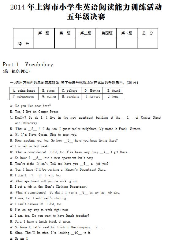 11月1-3日,上海中环杯英语阅读能力将要开考。下面收集了上海第一届中环杯英语阅读能力竞赛五年级的真题和答案,供参考。