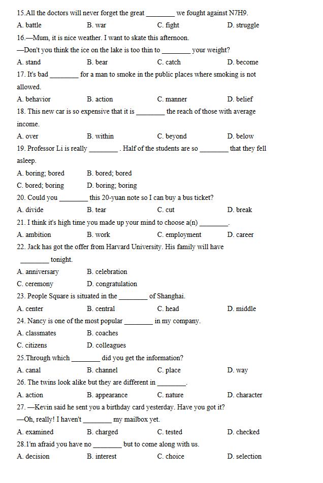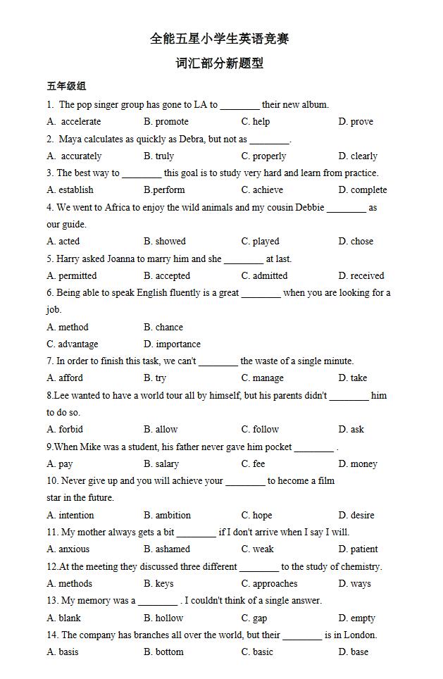 2016年第十届全能五星即将在11月19日开考,下文为备考全能五星的上海考生准备了五年级组词汇新题型和答案,供参考。