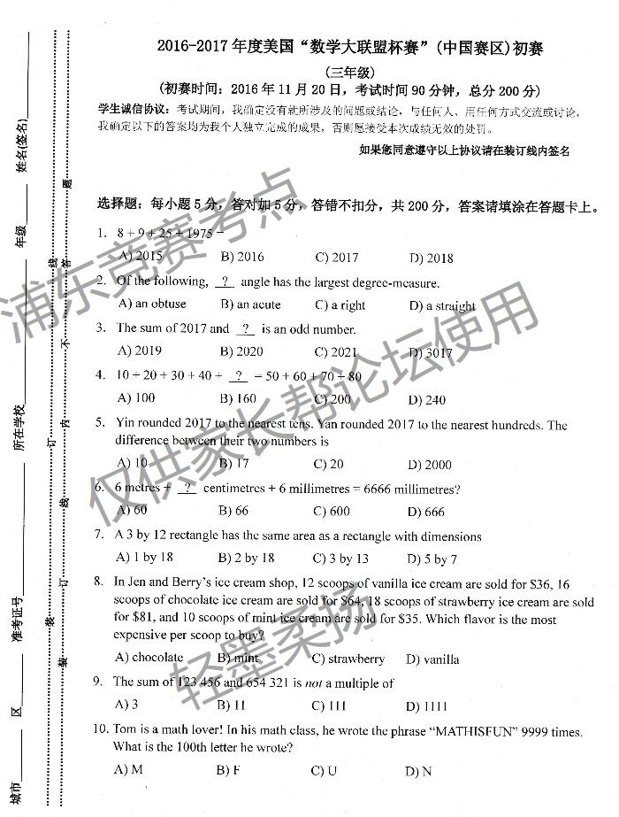 2016-2017年度美国数学大联盟中国上海赛区3-12年级初赛于11月20日结束了,下面是上海赛区数学大联盟三年级试卷,供参考。