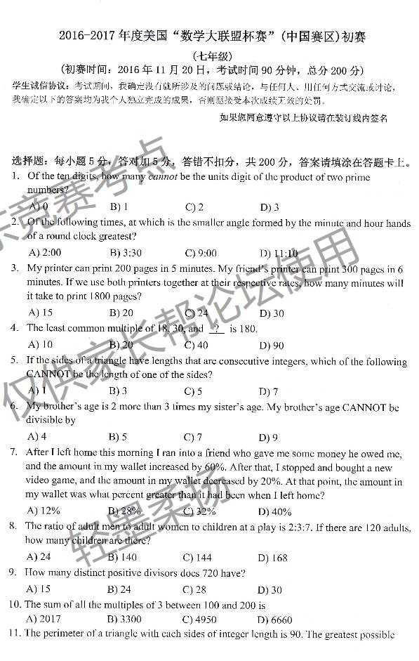 2016-2017年度美国数学大联盟中国上海赛区3-12年级初赛于11月20日结束了,下面是上海赛区数学大联盟七年级试卷,供参考。