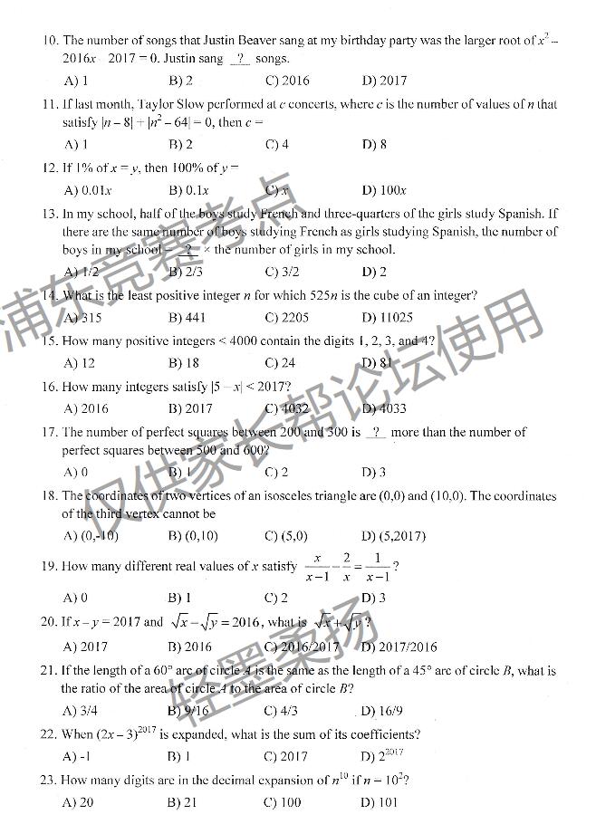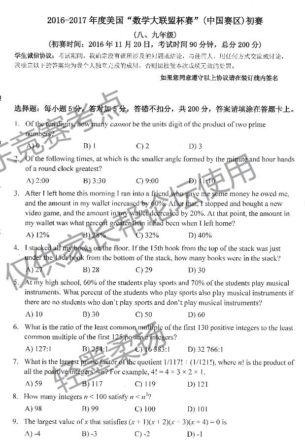 2016-2017年度美国数学大联盟中国上海赛区3-12年级初赛于11月20日结束了,下面是上海赛区数学大联盟八、九年级试卷,供参考。